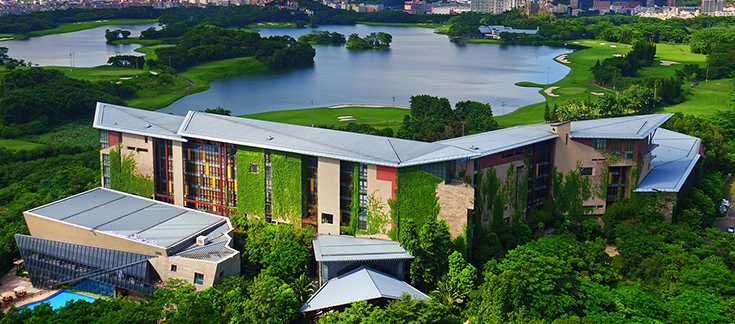 酒店背倚龍湖碧波瀲滟